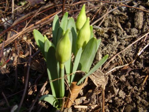 枯れ草と木屑におおわれていた、 枯れ色の庭に、 点描画の緑の点が点々と、 水仙の葉と花芽が、 申し合わせて、 祖先からの約束を一斉に、 いのちの静かな快哉。 春の七草は、何だったかな。 「セリ、ナズナ、ゴギョウ、ハコベラ、 ホトケノザ、スズナ、スズ…